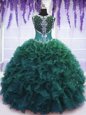 Straps Sleeveless Tulle Floor Length Zipper Ball Gown Prom Dress in Dark Green for with Beading and Ruffles