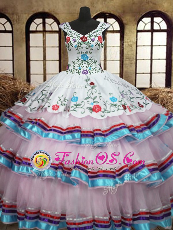 Straps White Lace Up Quinceanera Gowns Embroidery and Ruffled Layers Sleeveless Floor Length