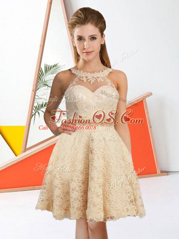 Home >  Bridesmaid Dresses >  Hot Sale Bridsmaid Dresses > Stunning A-line Bridesmaid Dresses Champagne Halter Top Lace Sleeveless Knee Length Zipper