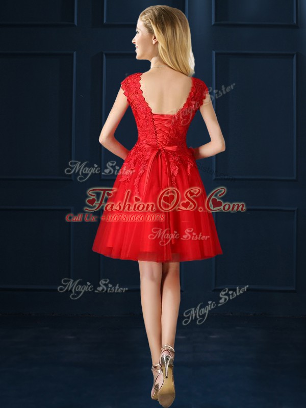 Stunning Baby Blue Lace Up Quinceanera Court of Honor Dress Lace and Belt Cap Sleeves Knee Length