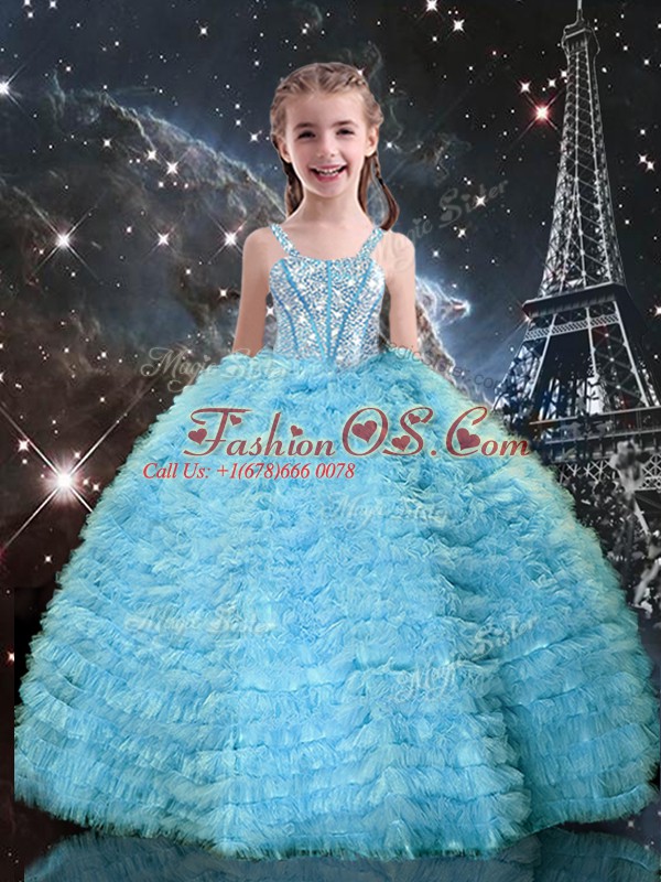 Home >  Special Occasion Dresses >  Mini Quinceanera Dresses > Stunning Floor Length Aqua Blue Custom Made Pageant Dress Tulle Sleeveless Beading and Ruffled Layers