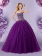 Stunning Floor Length Dark Purple 15th Birthday Dress Tulle Sleeveless Beading