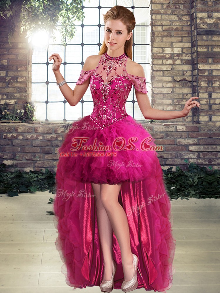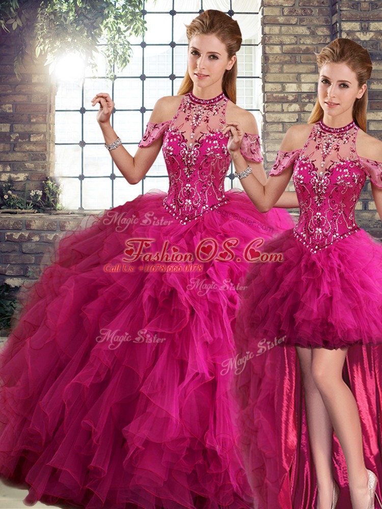 Stunning Fuchsia Lace Up Halter Top Beading and Ruffles Vestidos de Quinceanera Tulle Sleeveless