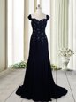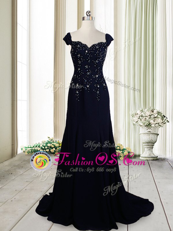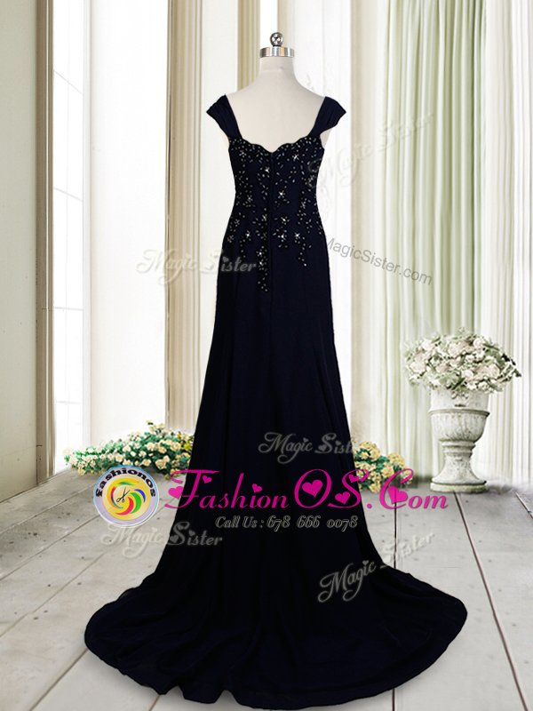 Stunning Navy Blue Zipper Straps Beading Celebrity Style Dress Chiffon Cap Sleeves Brush Train