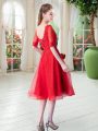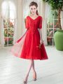 Stunning V-neck Half Sleeves Homecoming Dress Knee Length Beading and Appliques Red Tulle