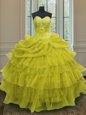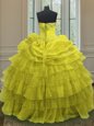 Home >  Quinceanera Dresses >  Cute Quinceanera Dresses > Stunning Yellow Organza Lace Up Sweetheart Sleeveless Floor Length Sweet 16 Quinceanera Dress Beading and Ruffled Layers and Pick Ups