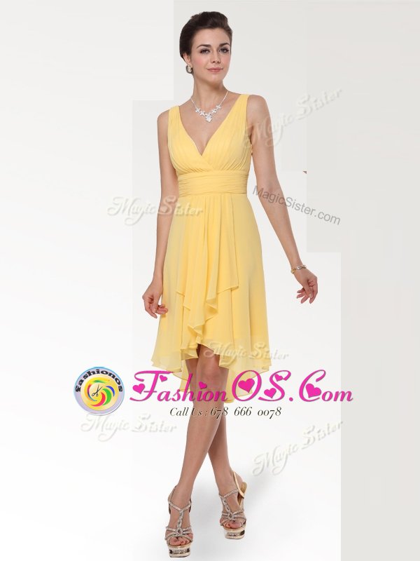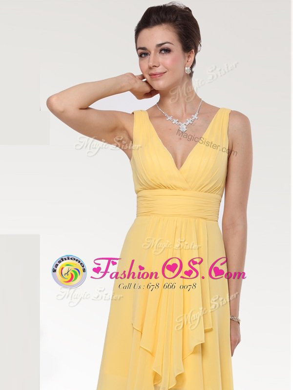 Stunning Yellow Zipper V-neck Ruching Evening Dress Chiffon Sleeveless
