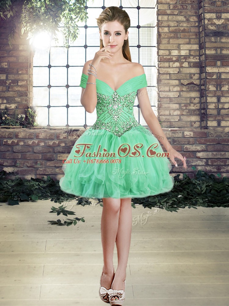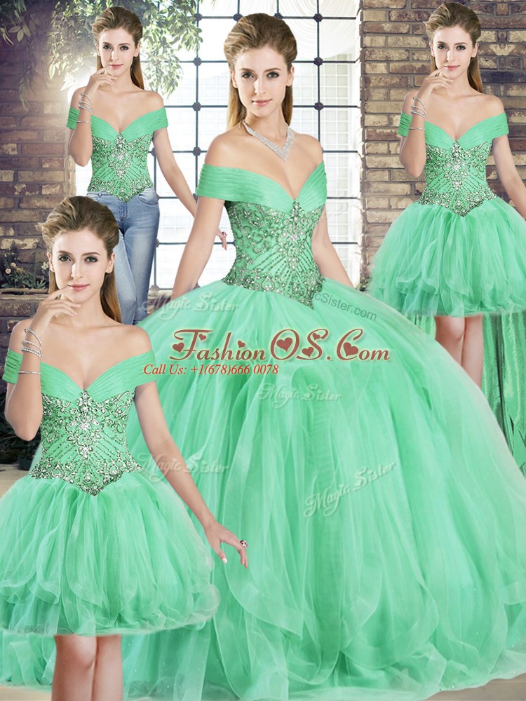 Stylish Apple Green Tulle Lace Up Off The Shoulder Sleeveless Floor Length Quince Ball Gowns Beading and Ruffles