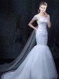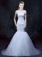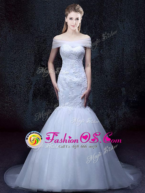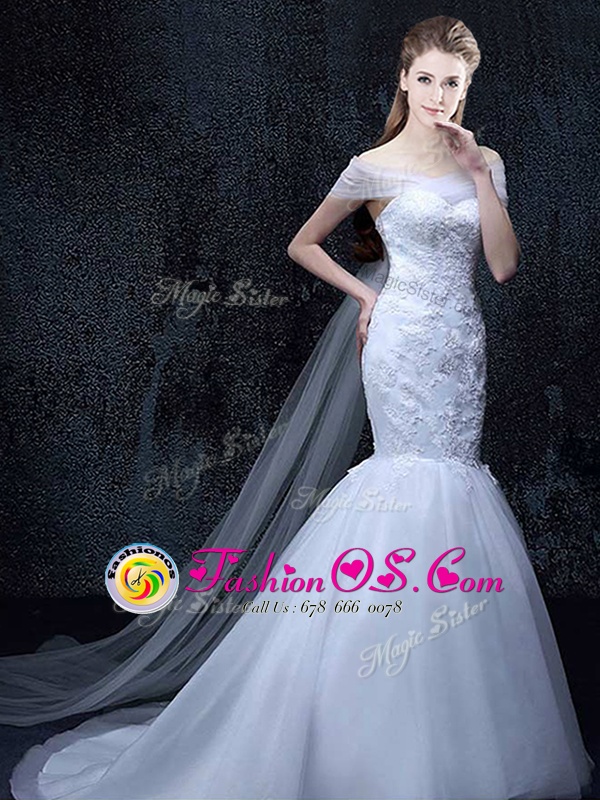 Stylish Brush Train Mermaid Wedding Gown White Off The Shoulder Tulle Short Sleeves With Train Lace Up