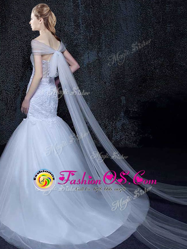 Home >  Wedding Dresses >  Fashionable Wedding Dresses > Stylish Brush Train Mermaid Wedding Gown White Off The Shoulder Tulle Short Sleeves With Train Lace Up