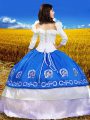 Silhouette: Ball Gowns Neckline: off the shoulder Sleeve Length: 3|4 length sleeve Hemline/Train: floor length Back Detail: lace up Embellishment: embroidery Fabric: taffeta Shown Color: blue(Color & Style representation may vary by monitor.) Occasion: military ball,sweet 16,quinceanera Season: spring,summer,fall,winter Fully Lined: Yes Built-In Bra: Yes
