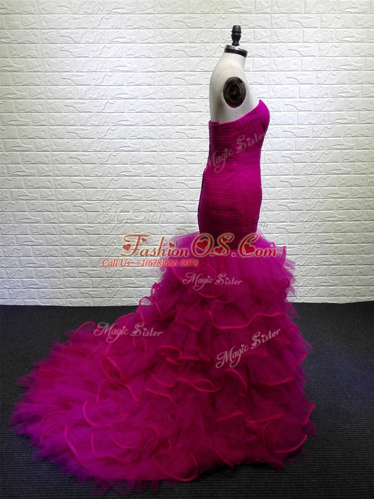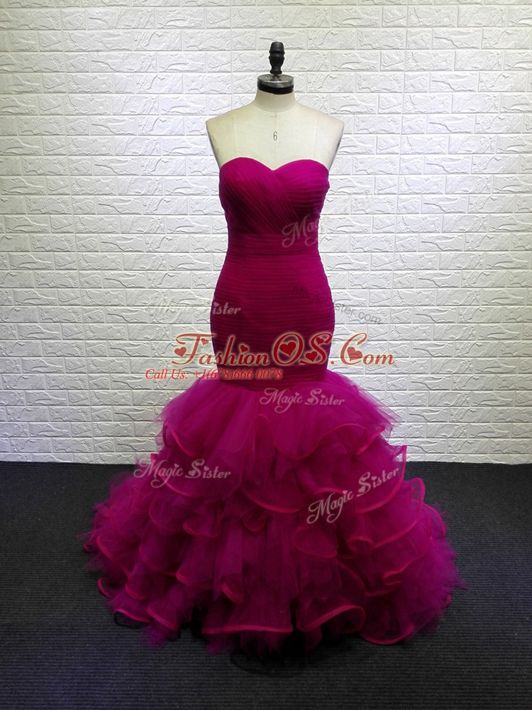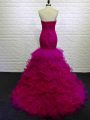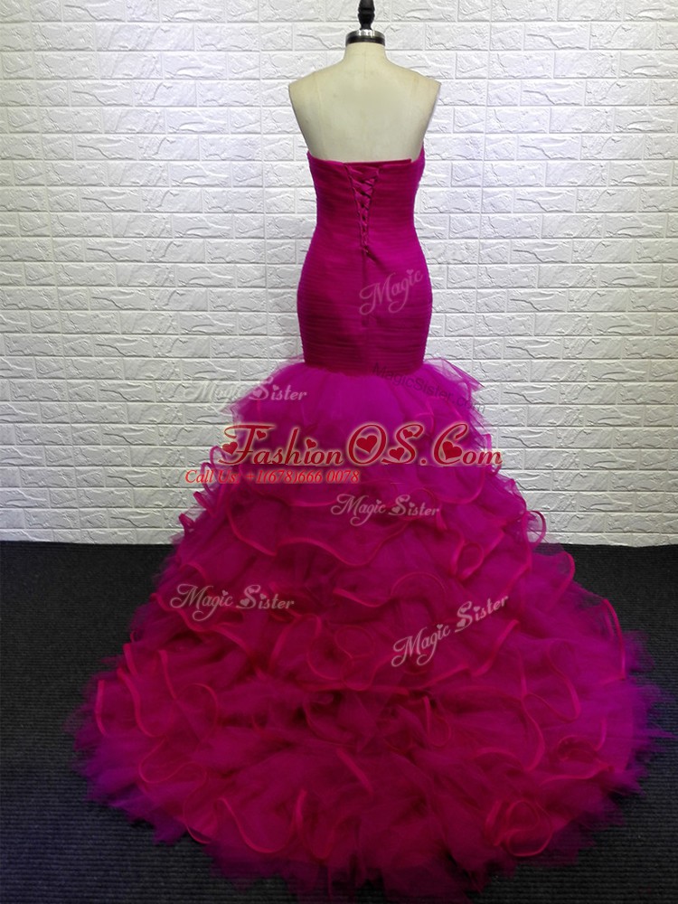 Stylish Fuchsia Sweetheart Lace Up Beading and Ruching Brush Train Sleeveless