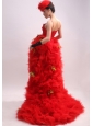 The bodice accented by the exquisite hand flowers and the ruched details flatters most figures.It truly is an example of high end couture fashion.The skirt is spaghetti-strapped and winding series of ruffles that begins at the hips and envelopes the legs in luxurious tulle all the way to the floor. You are sure to be charming and fabulous at your very special day.A hidden zipper up back completes the look.