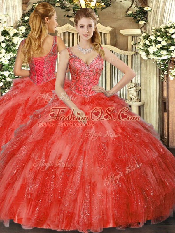 Home >  Quinceanera Dresses >  Fast Delivery Quinceanera Dresses > Stylish Red Sleeveless Tulle Lace Up Quinceanera Gowns for Military Ball and Sweet 16 and Quinceanera