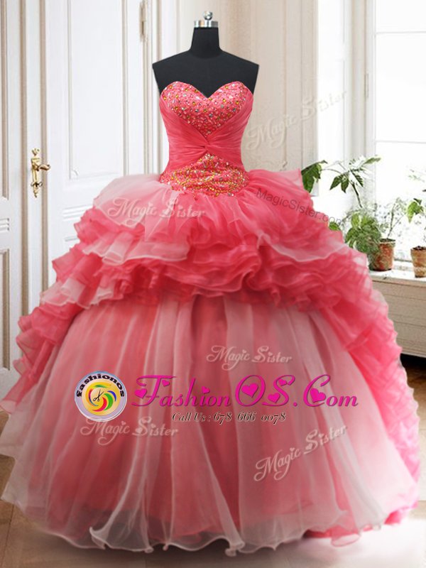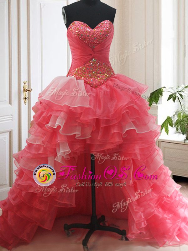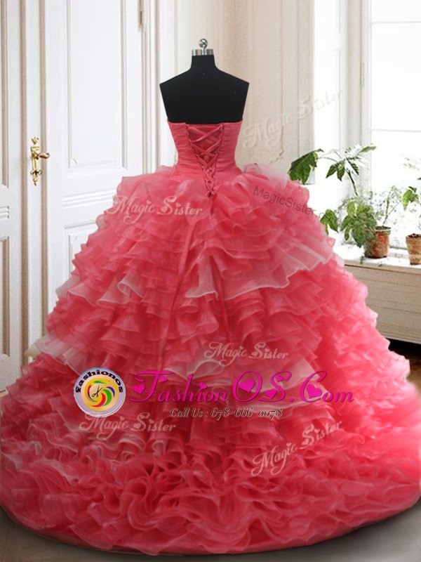Stylish Three Piece Sleeveless Beading and Ruffled Layers Lace Up Sweet 16 Quinceanera Dress with White and Coral Red Brush Train