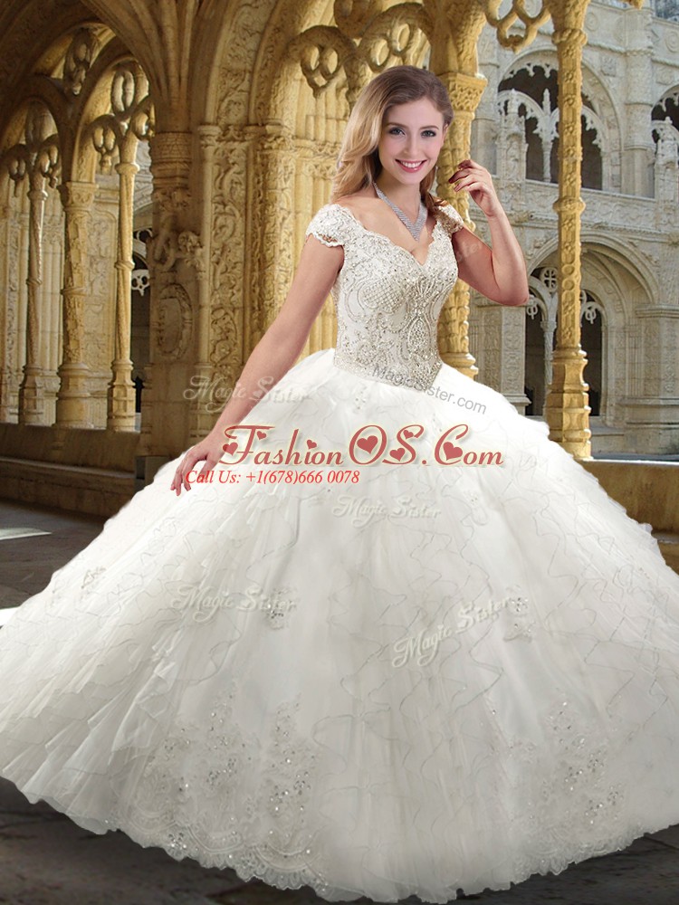 Stylish White V-neck Zipper Beading and Ruffles Wedding Gowns Cap Sleeves
