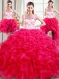 Suitable Four Piece Hot Pink Sweet 16 Quinceanera Dress Military Ball and Sweet 16 and Quinceanera and For with Beading and Ruffles Straps Sleeveless Lace Up