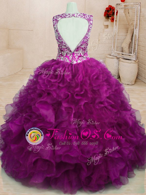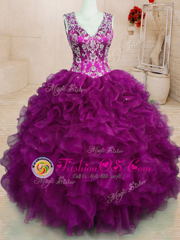 Suitable Fuchsia Ball Gowns Beading and Embroidery and Ruffles Ball Gown Prom Dress Backless Organza Sleeveless Floor Length