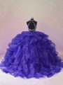 Suitable Purple Two Pieces Organza Halter Top Sleeveless Beading and Ruffles Backless Quinceanera Gowns Brush Train