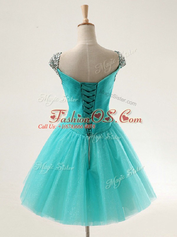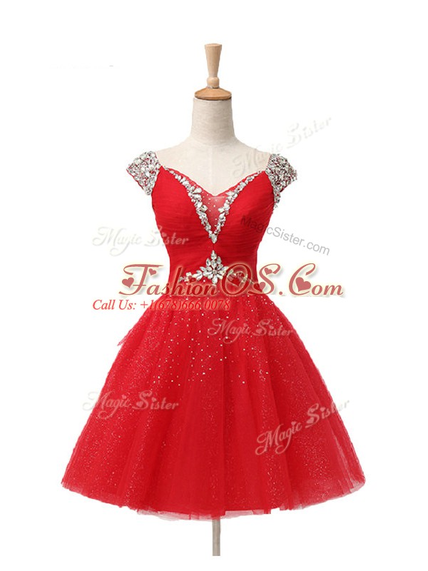 Suitable Red A-line Tulle V-neck Cap Sleeves Beading and Sequins Mini Length Lace Up