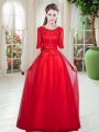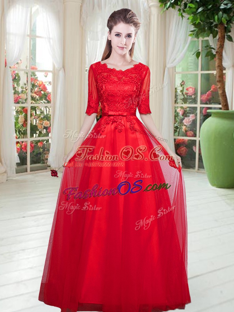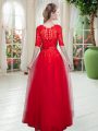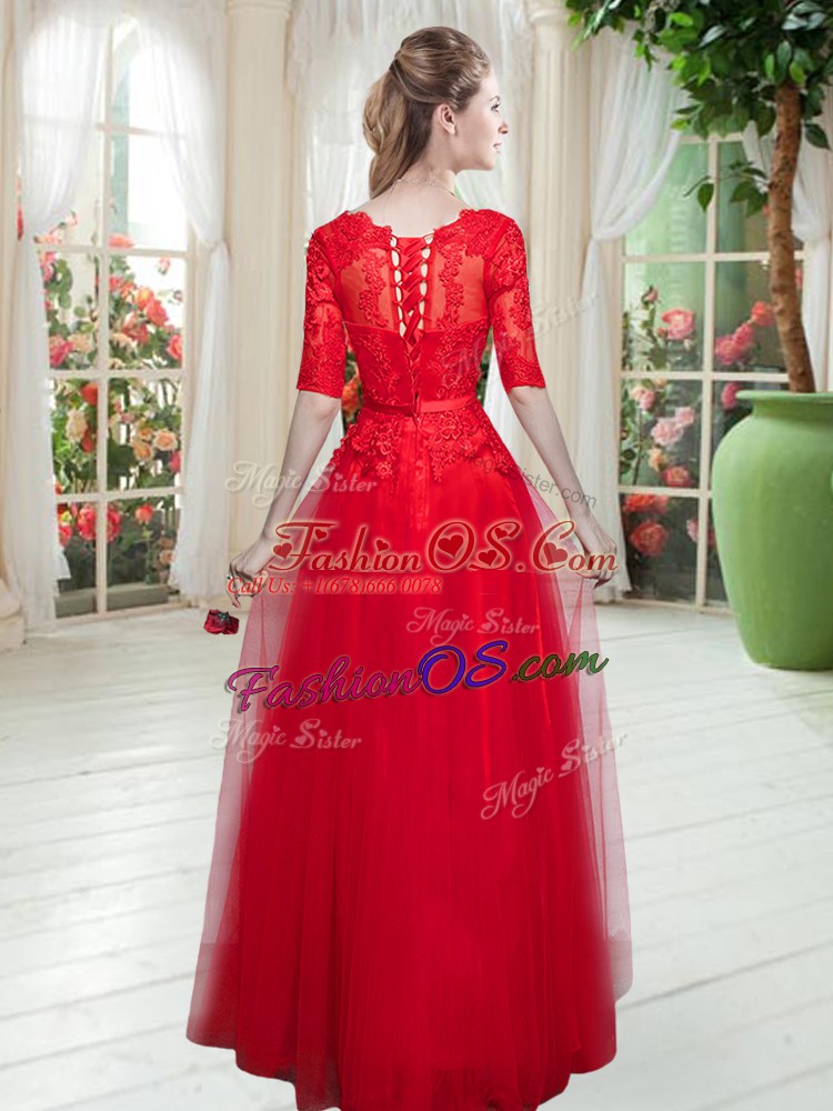 Suitable Scoop Half Sleeves Lace Up Evening Dress Red Tulle