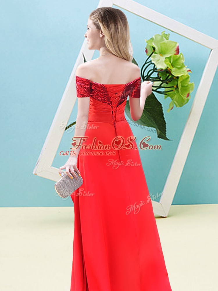 Home >  Prom Dresses >  Fashionable Prom Dresses > Suitable Short Sleeves Elastic Woven Satin and Sequined High Low Lace Up Homecoming Dress in Fuchsia with Beading