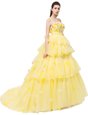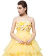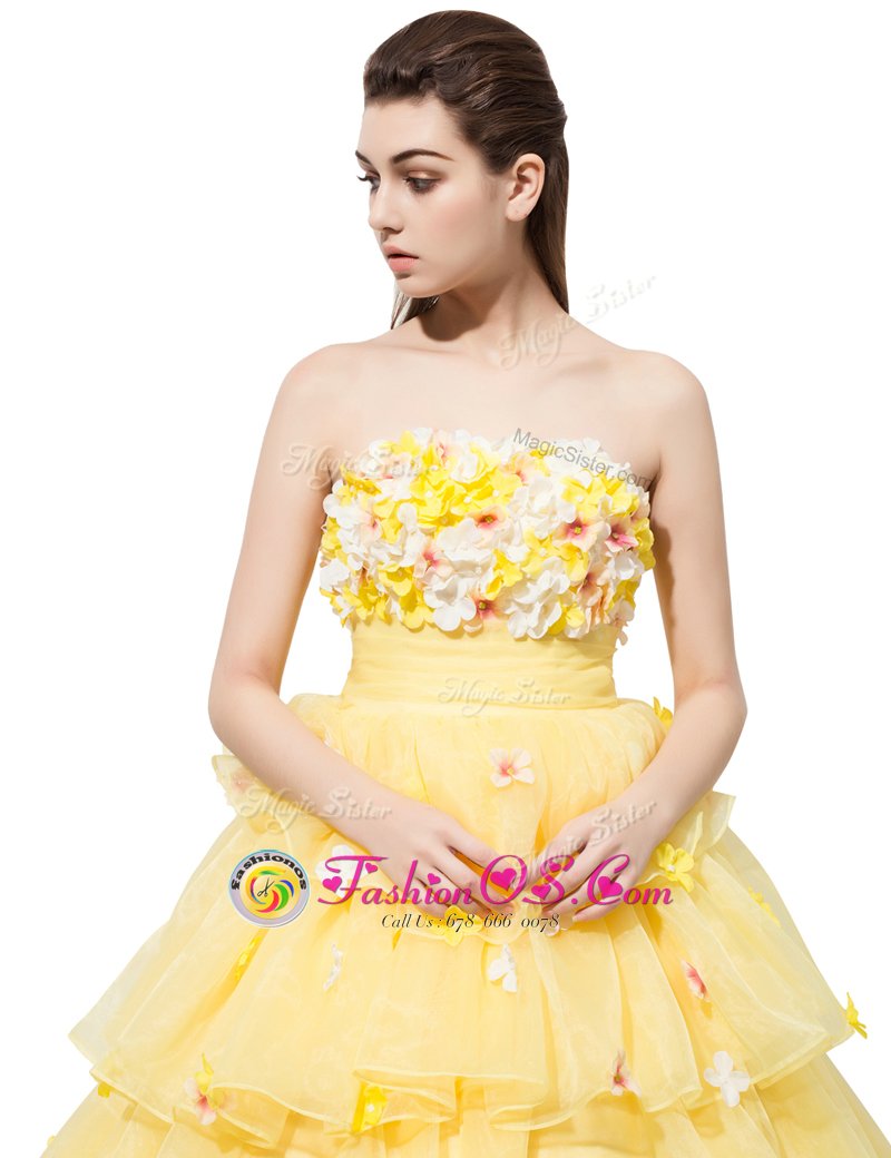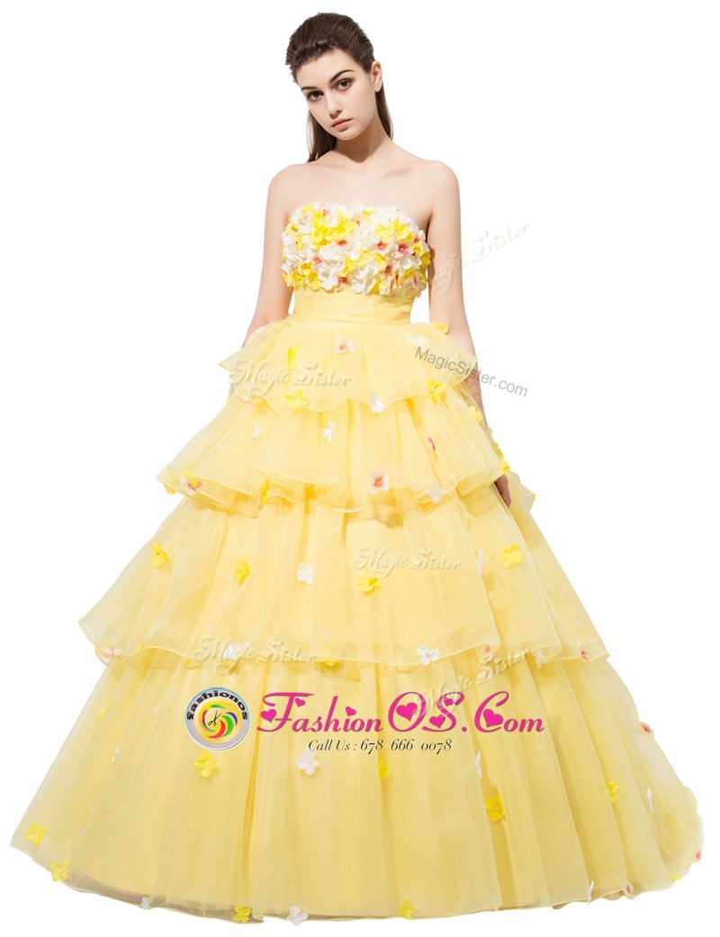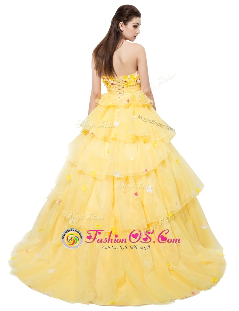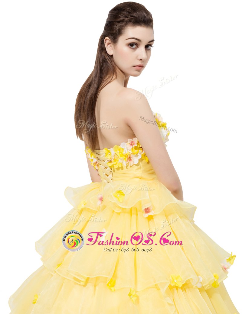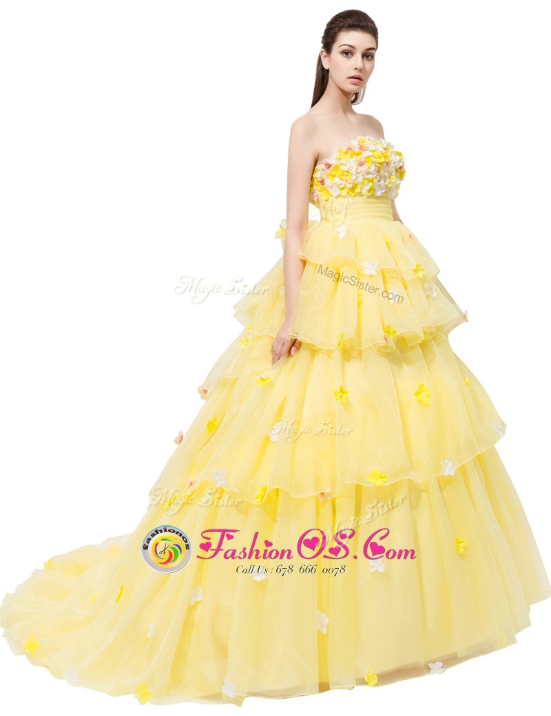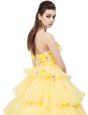 Home >  Prom Dresses >  Perfect Prom Dresses > Suitable Sleeveless With Train Ruffled Layers and Hand Made Flower Lace Up Homecoming Dress with Yellow