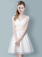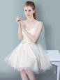 Suitable Straps Champagne Tulle Zipper Bridesmaids Dress Cap Sleeves Knee Length Ruching and Bowknot