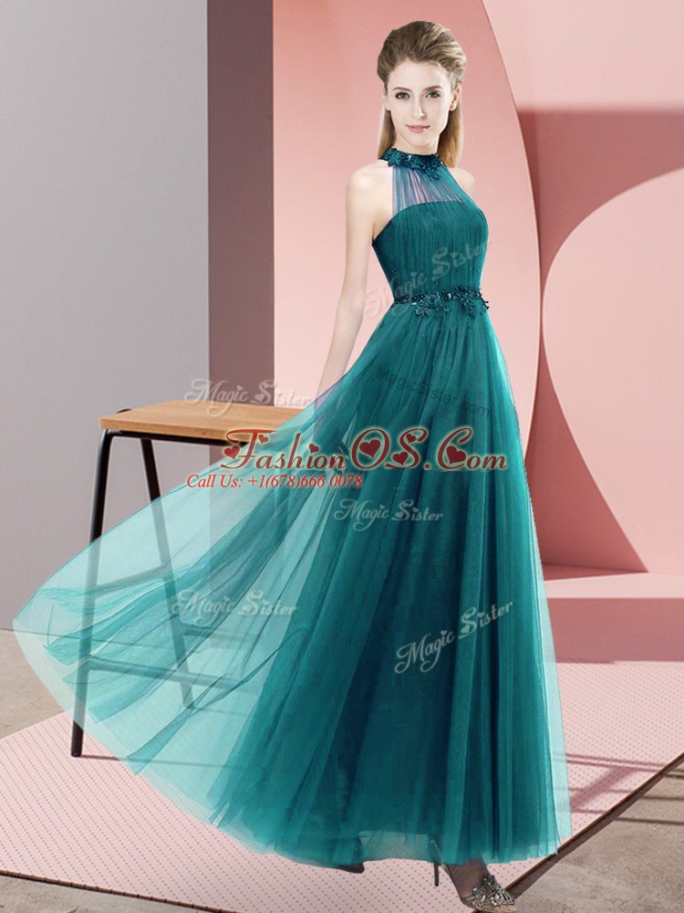 Home >  Special Occasion Dresses >  Discount Dama Dresses > Suitable Teal Lace Up Halter Top Beading and Appliques Quinceanera Court Dresses Tulle Sleeveless