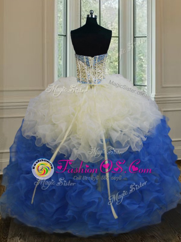 Sumptuous Blue And White Strapless Lace Up Beading and Ruffles Quinceanera Dresses Sleeveless