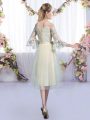 Sumptuous Champagne Empire Off The Shoulder 3 4 Length Sleeve Tulle Tea Length Lace Up Lace and Bowknot Bridesmaids Dress