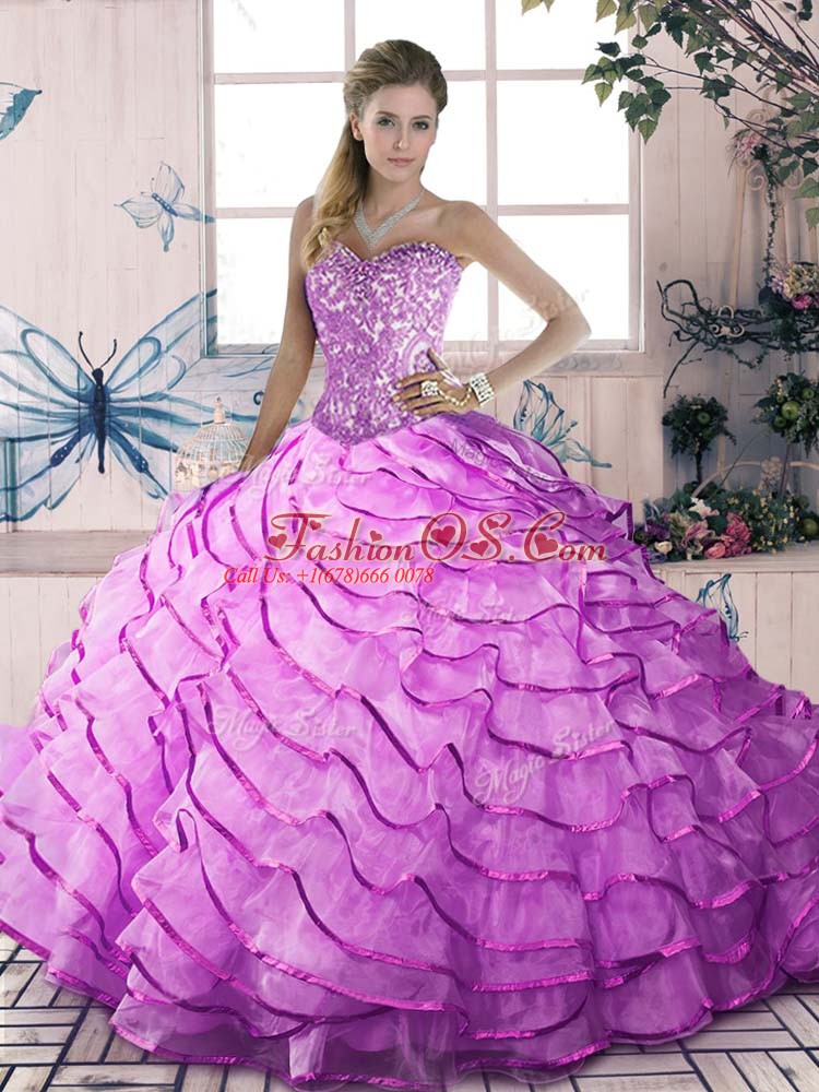 Sumptuous Lilac Ball Gowns Sweetheart Sleeveless Organza Brush Train Lace Up Beading and Ruffles Quince Ball Gowns