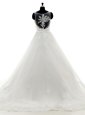 Sumptuous Off the Shoulder Lace Bridal Gown White Clasp Handle Half Sleeves With Brush Train
