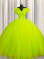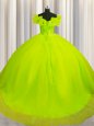 Sumptuous Off The Shoulder Short Sleeves Court Train Lace Up Vestidos de Quinceanera Yellow Green Tulle