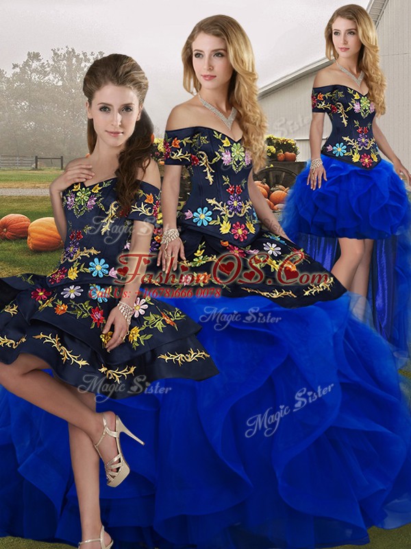 Sumptuous Off The Shoulder Sleeveless Quinceanera Gown Floor Length Embroidery and Ruffles Blue And Black Tulle