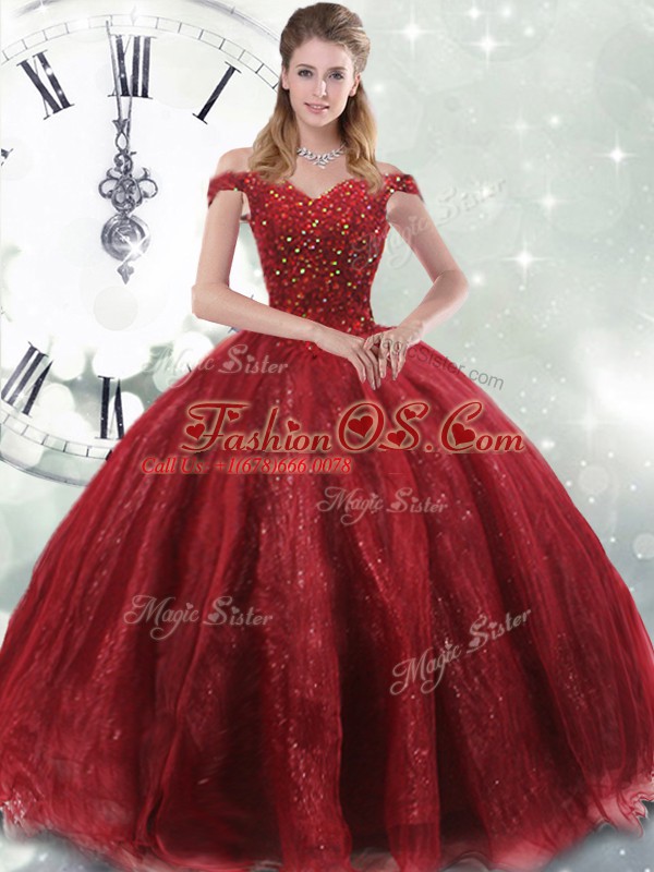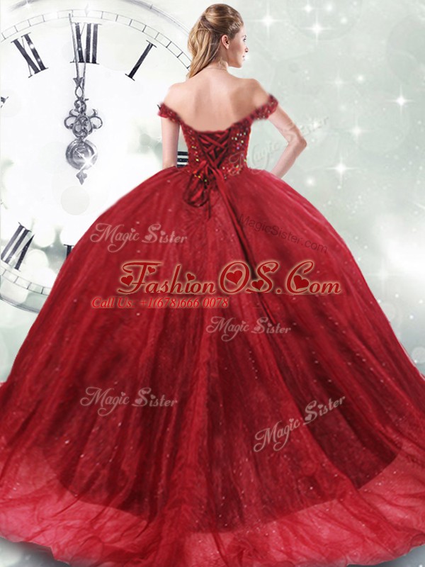 Sumptuous Off The Shoulder Sleeveless Tulle Sweet 16 Dresses Beading Brush Train Lace Up