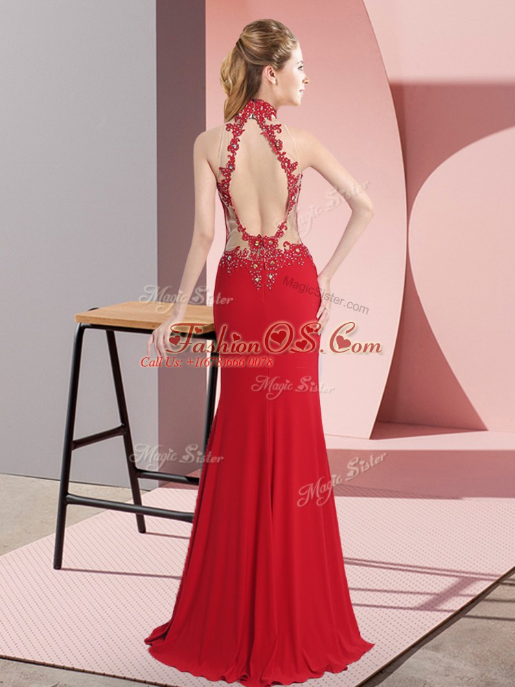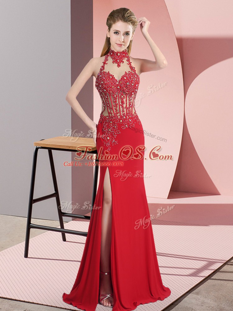 Home >  Prom Dresses >  Prom Dresses 2019 > Sumptuous Red Halter Top Sleeveless Chiffon Floor Length Backless Lace and Appliques