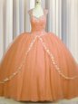 Sumptuous See Through Back Orange Sweetheart Zipper Beading and Appliques Quince Ball Gowns Brush Train Cap Sleeves