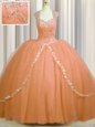 Home >  Quinceanera Dresses >  Luxurious Quinceanera Dresses > Sumptuous See Through Back Orange Sweetheart Zipper Beading and Appliques Quince Ball Gowns Brush Train Cap Sleeves