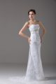 Sumptuous Sleeveless Beading and Lace and Belt Zipper Wedding Gowns with White Brush Train