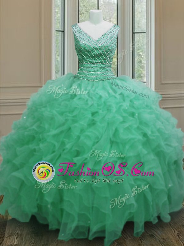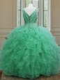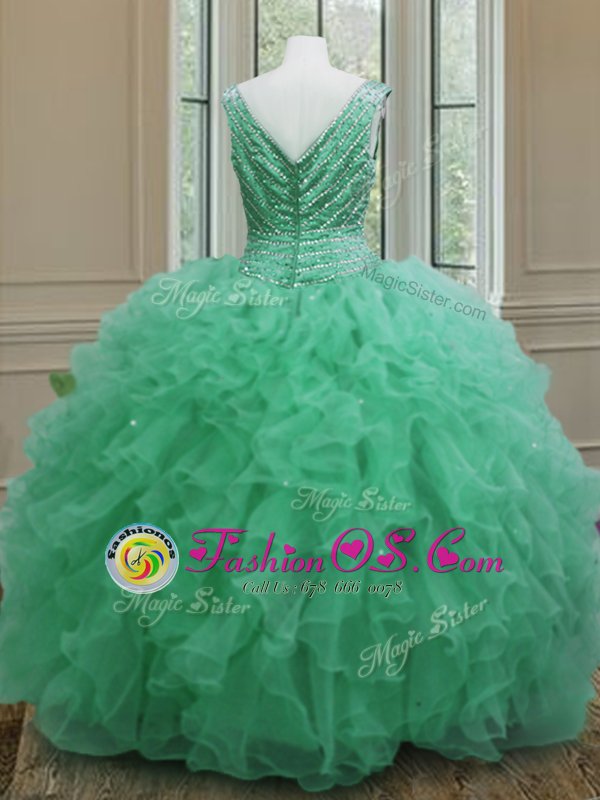 Sumptuous Sleeveless Floor Length Beading and Ruffles Zipper Quince Ball Gowns with Apple Green