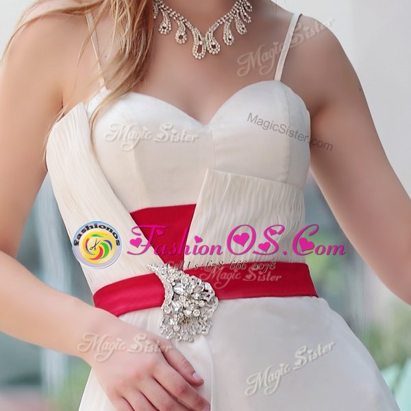 Sumptuous White Satin Side Zipper Spaghetti Straps Sleeveless Floor Length Belt