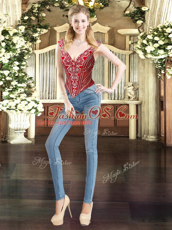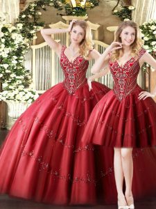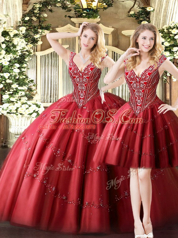 Home >  Quinceanera Dresses >  Detachable Quinceanera Skirts > Sumptuous Wine Red Tulle Lace Up V-neck Sleeveless Floor Length Quinceanera Dresses Beading