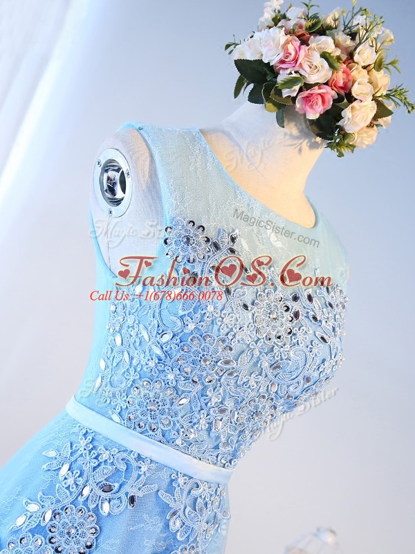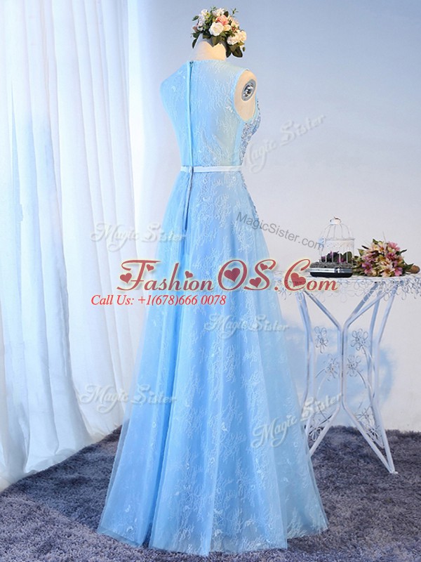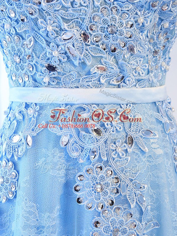 Super Baby Blue Zipper Party Dress for Toddlers Beading and Lace and Appliques and Belt Sleeveless Floor Length