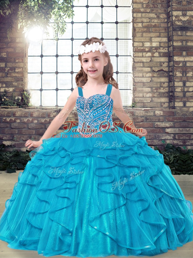 Super Beading and Ruffles Girls Pageant Dresses Blue Lace Up Sleeveless Floor Length