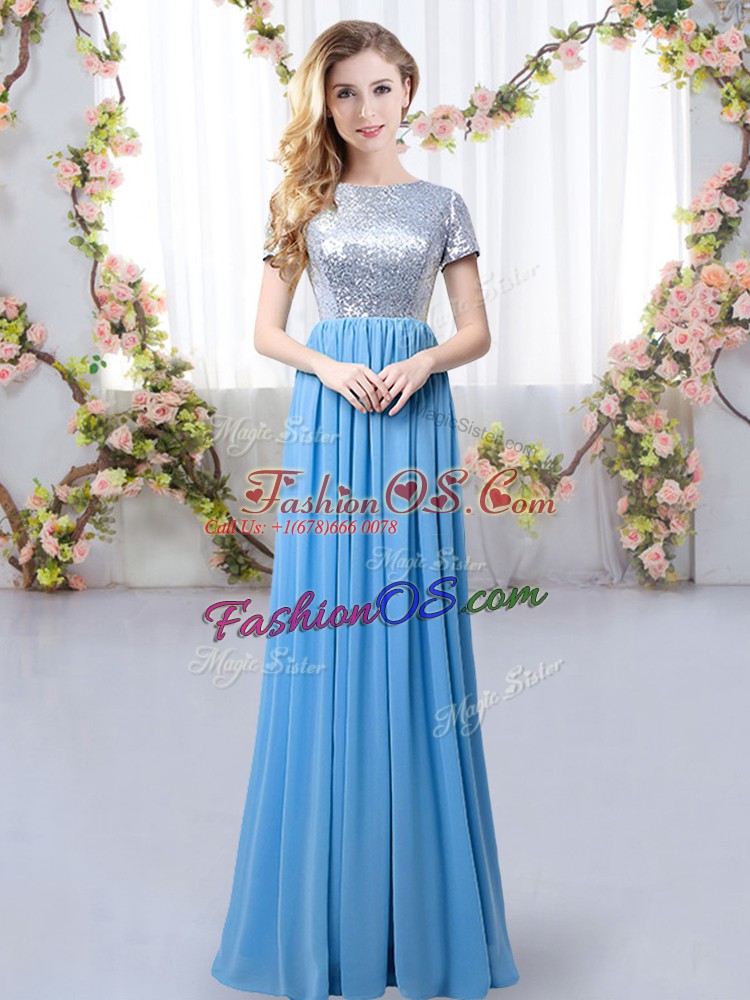 Super Blue Zipper Vestidos de Damas Sequins Short Sleeves Floor Length
