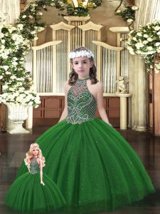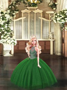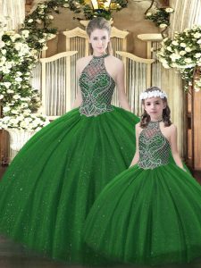Super Floor Length Dark Green Quinceanera Dresses Halter Top Sleeveless Lace Up
