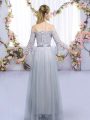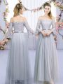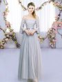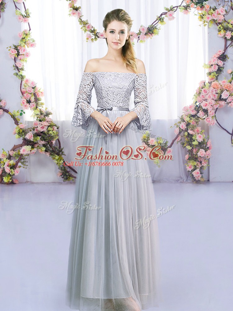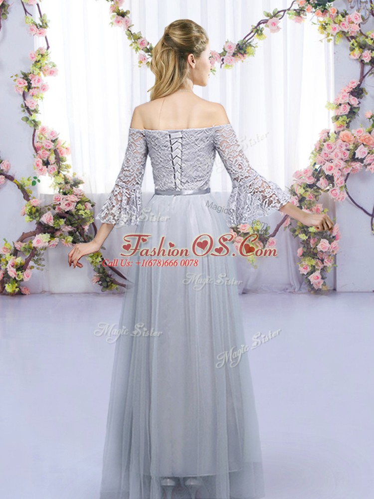 Super Grey Empire Off The Shoulder 3 4 Length Sleeve Tulle Floor Length Lace Up Lace and Belt Bridesmaid Gown