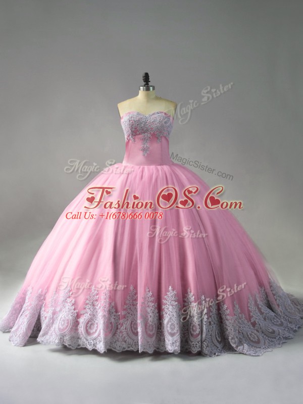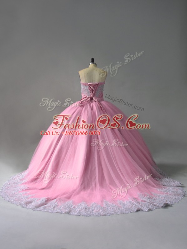 Super Lace Up Quinceanera Dress Pink for Sweet 16 and Quinceanera with Beading and Appliques Court Train