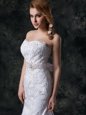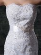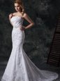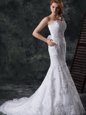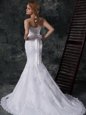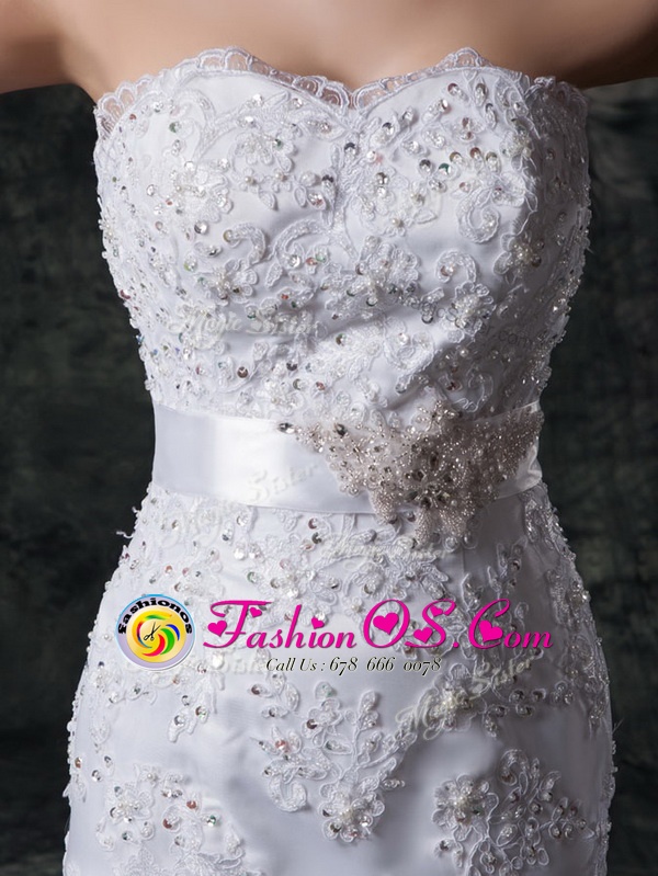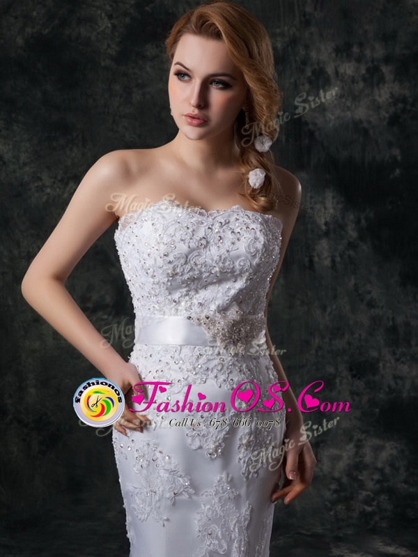 Home >  Wedding Dresses >  Perfect Wedding Dresses > Super Mermaid Lace Sweetheart Sleeveless Brush Train Lace Up Beading and Appliques and Bowknot and Belt Wedding Dress in White